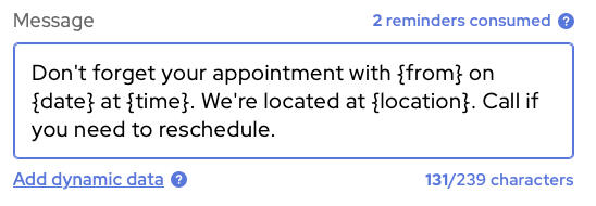 The final calculation for the number of reminders consumed by your message will be determined by any dynamic data that’s inserted into your message: