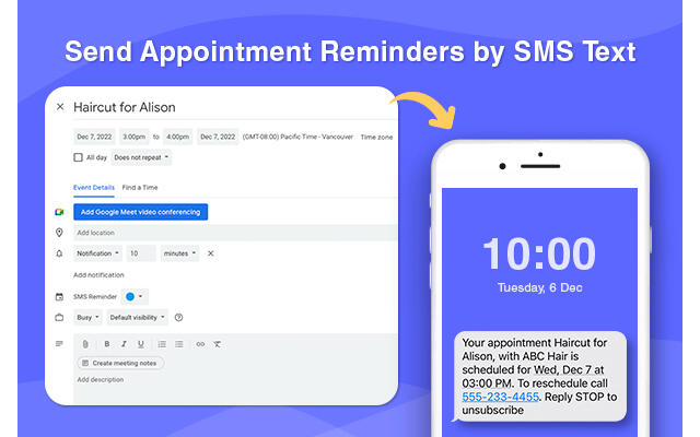 Send a reminder by SMS text message to your customer directly from your Google Calendar™ . The app will auto-populate the date & time of the appointment for you.