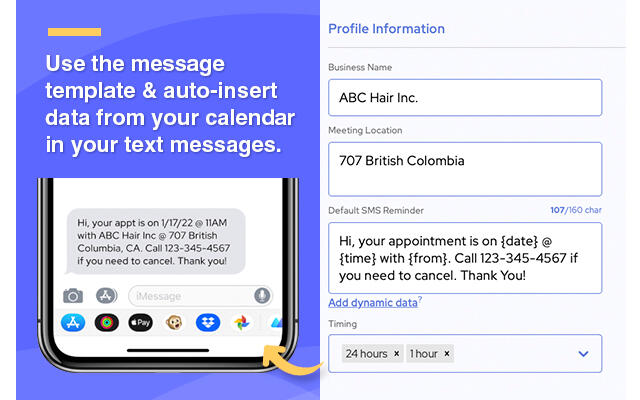 Setup your message template. You can insert data from your calendar into the message automatically such as the date & time of the appointment.