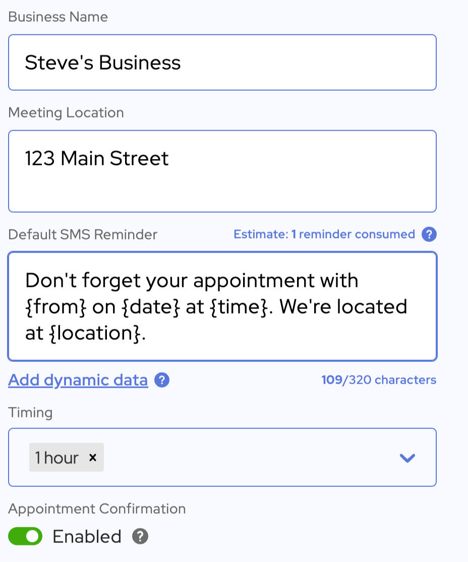 Note: If you include a URL in your message this will consume a lot of characters.The calculator in your account settings will estimate the number of reminders consumed, but the actual number may differ for each individual reminder, depending on the data that’s inserted into the message. Open the appointment in the app to check the exact number of reminders that will be consumed when the reminder is sent.
