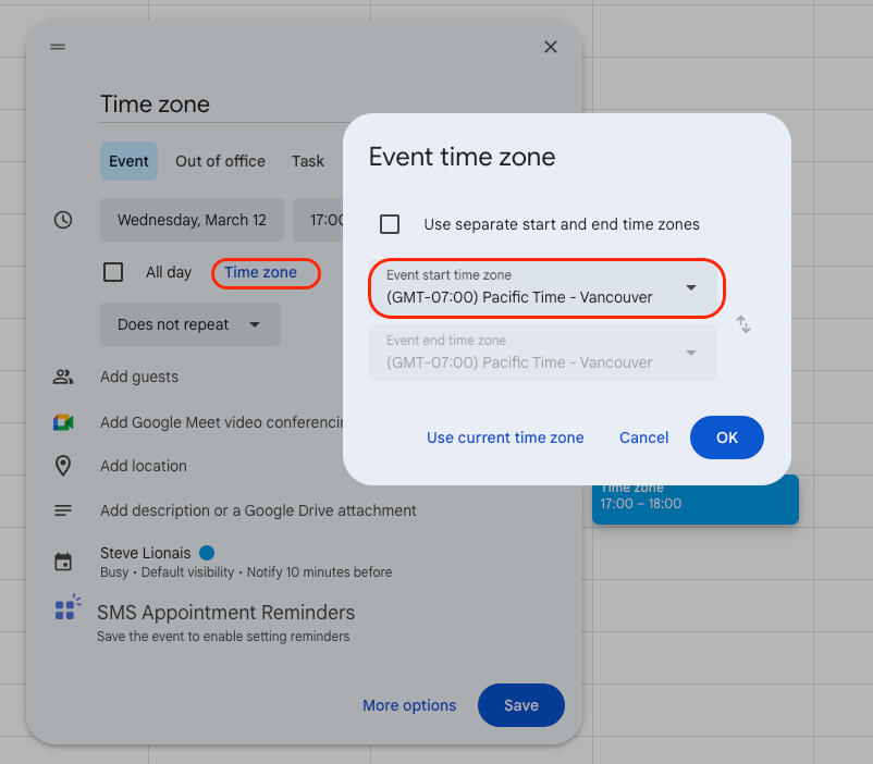 By default the app will send reminders in the time zone that your Google calendar is set to. If you have appointments in other timezones, you can tell the app to send the reminder message in the recipient's local time zone. The appointment will appear on your calendar in your local time and the recipient will get the reminder in their local time.