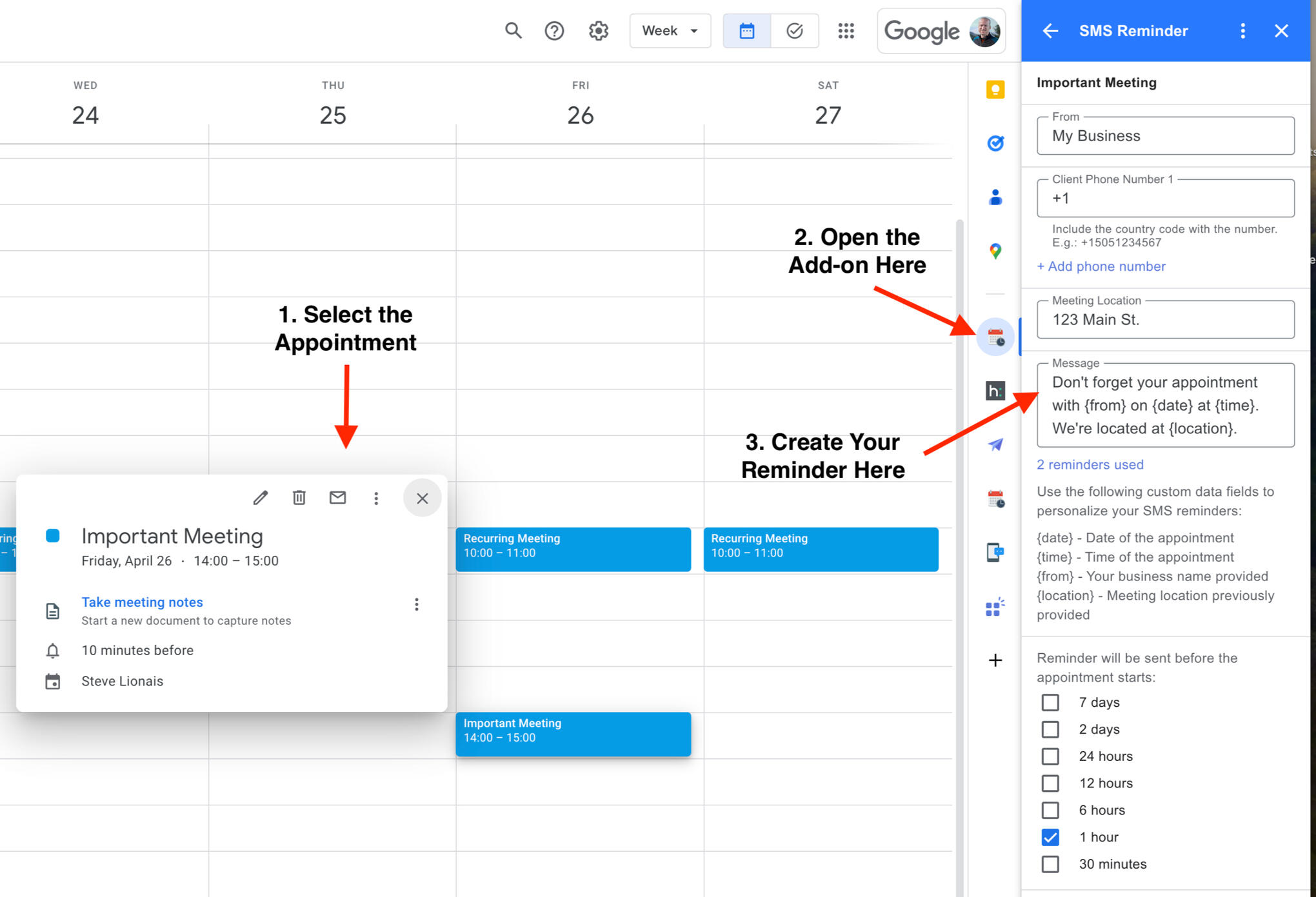 Select an appointment in your calendar then open the add-on from the sidebar. Now you can add the recipient's phone number and activate the reminder.