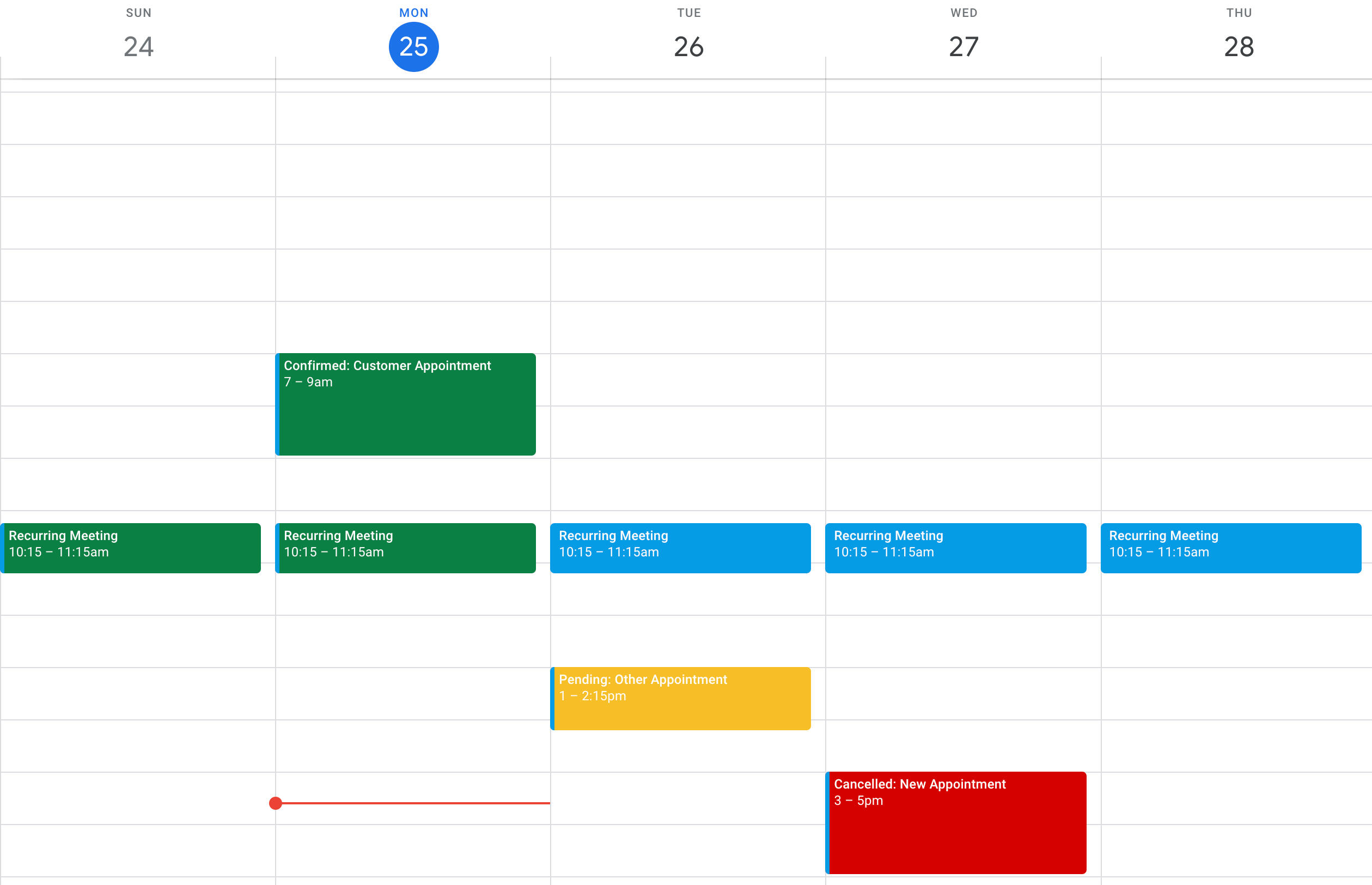 With appointment confirmations are enabled, the SMS Reminder app will update your calendar and let you know the status of your appointments. The app appends that status to the front of your existing appointment's Title and it will change the colour of appointment: