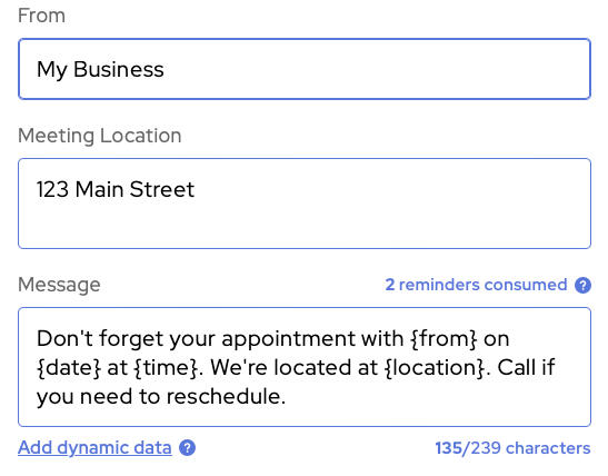 Note: If you include a URL in your message this will consume a lot of characters.The calculator in your account settings will estimate the number of reminders consumed, but the actual number may differ for each individual reminder, depending on the data that’s inserted into the message. Open the appointment in the app to check the exact number of reminders that will be consumed when the reminder is sent.