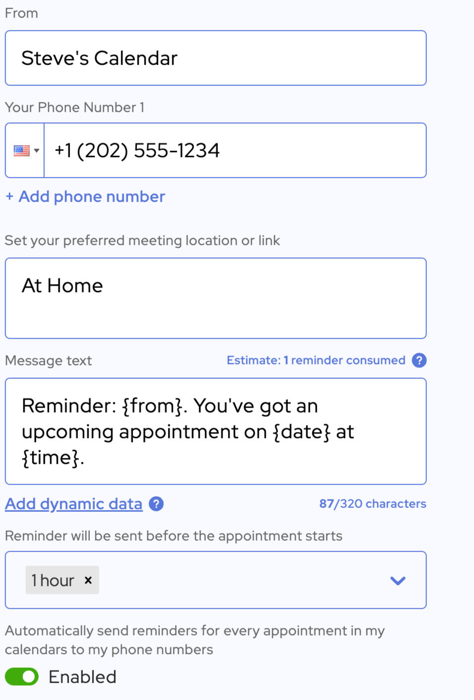 Add your phone number and all reminders will auto-populate to send to your number. You can also tell the app to auto-set reminders for all your appointments.
